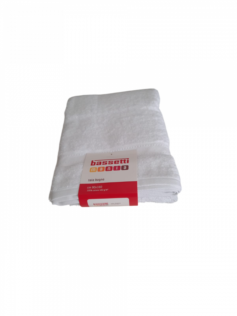 Bassetti Mania. Telo bagno tinta unita in spugna di puro cotone. Il telo misura cm. 90x160 e ha una grammatura di 430 gr./mq. Tessuto : 100% cotone. Cotone di alta qualita' che garantisce al prodotto confort e benessere, resistenza all'usura e ai lavaggi. Bassetti garantisce che nella produzione dei suoi prodotti non viene utilizzata manodopera infantile. Istruzioni di lavaggio al capo. Confezione : cavallotto in cartoncino, e busta in plastica. Prodotto made in Pakistan.