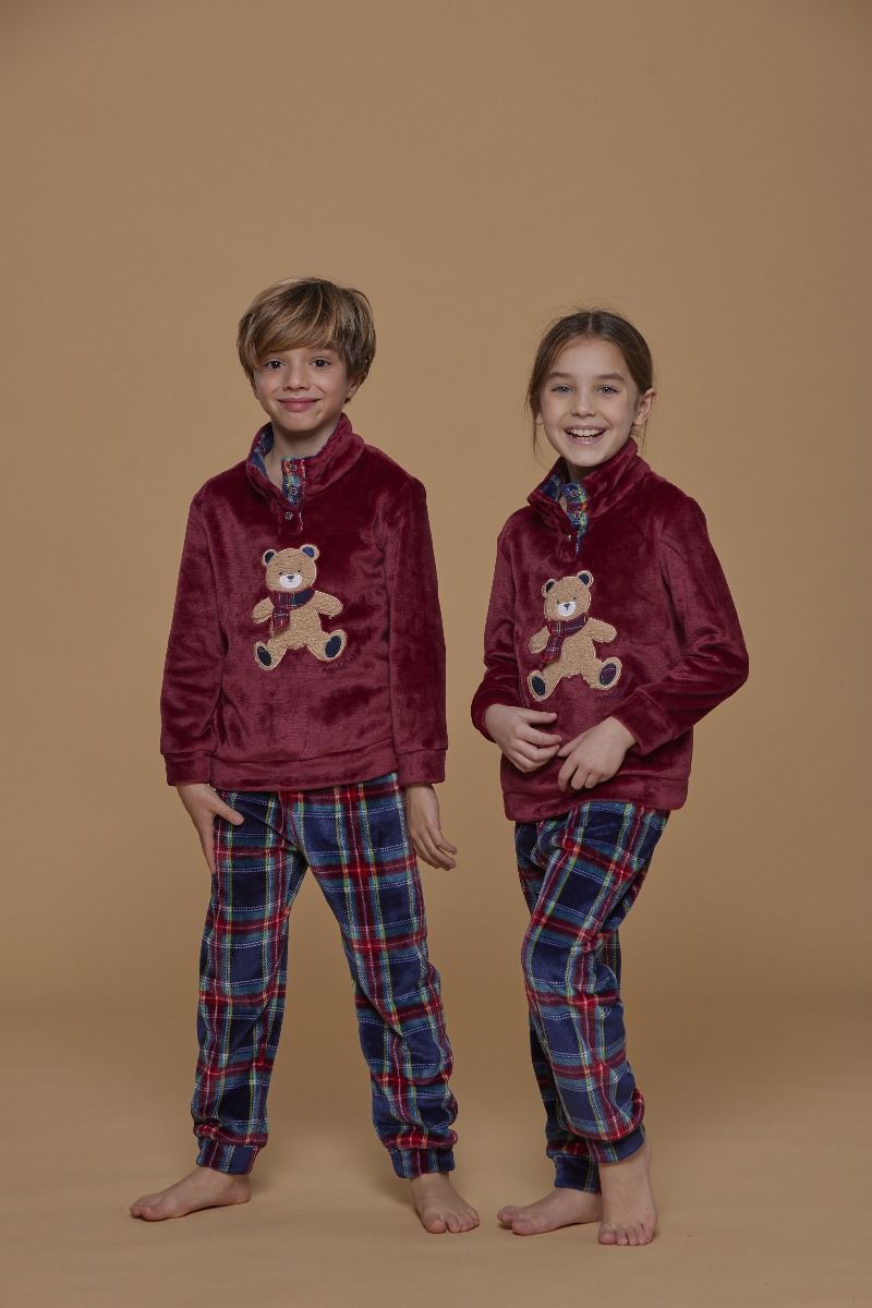 SIMPATICO CALDO E CONFORTEVOLE IL PIGIAMA DI NOI DI NOTTE PER BAMBINO E BAMBINA. REALIZZATO IN MORBIDO CORAL FLEECE CON PANTALONE A QUADRI MULTICOLOR E CASACCA AMARANTO CON UN SIMPATICO ORSACCHIOTTO APPLICATO. PANTALONE CON POLSINI.CONFEZIONE SCATOLA IN CARTONE.