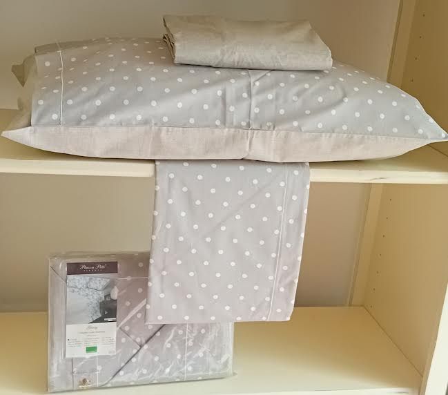 Completo lenzuola matrimoniale in puro cotone stampato di CAVALIERI. Un morbidissimo tessuto e una stampa a pois per un letto moderno, minimal e piacevole. Il completo e' composto da: un lenzuolo stampato per sopra cm. 250x290; un lenzuolo per sotto tinta unita con angoli maxi cm. 180x200x25; due federe cm. 52x82 stampate con un volan tinta unita solo da un lato. Tessuto: 100% cotone. Prodotto made in Italy. Istruzioni di lavaggio al capo. Confezione: busta in plastica.