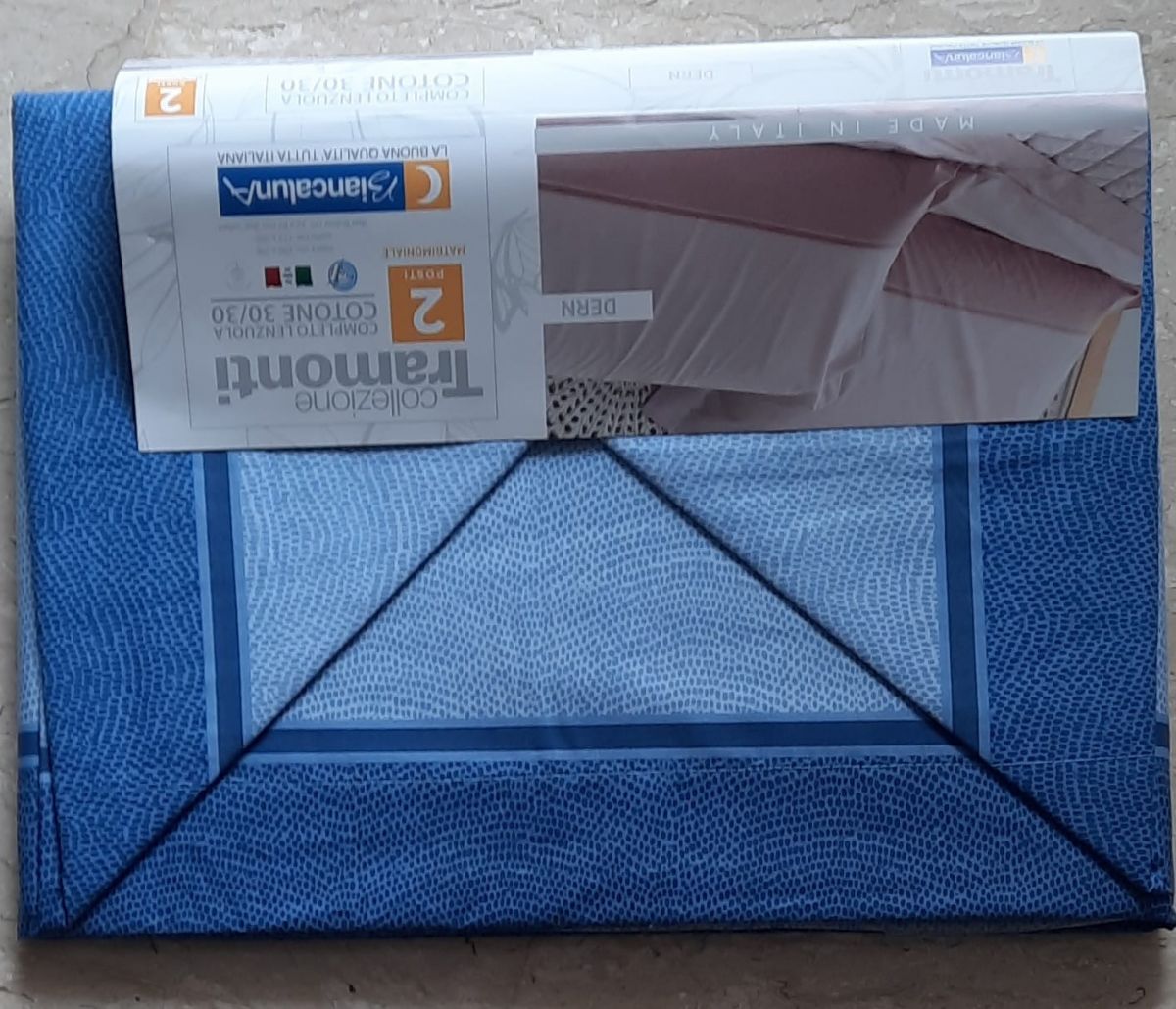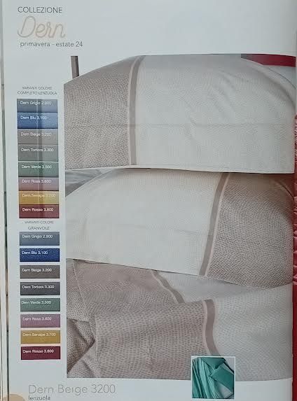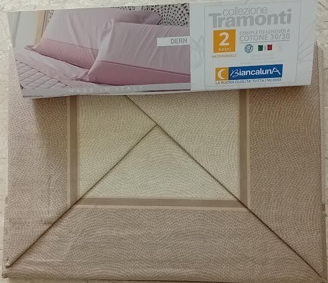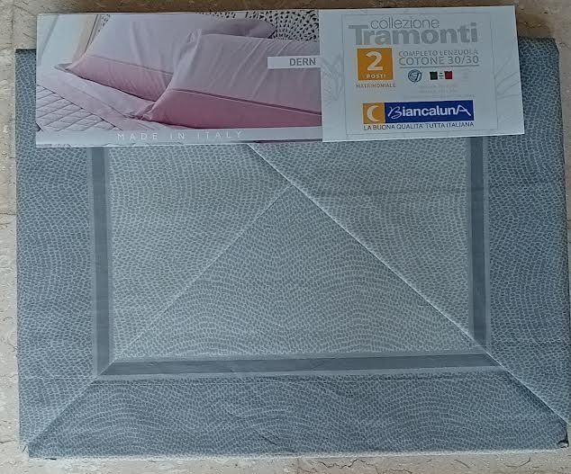 Sobrio e molto raffinato il disegno DERN della collezione Tramonti di Biancaluna. La collezione Tramonti, dove il design incontra la funzionalita' in ogni pezzo.La collezione incarna l'essenza dell'innovazione e dell'eleganza per il tuo stile di vita contemporaneo. Il disegno e' proposto qui nella versione completo lenzuola matrimoniale in puro cotone 30/30. Il completo e' composto da : un lenzuolo per sopra cm. 250x290; un lenzuolo sotto con angoli ed elastico cm.175x200x22; due federe a due volani cm. 52x82. Tessuto 100% cotone. Prodotto made in Italy. Confezione busta in plastica. Istruzioni di lavaggio al capo. Si consiglia di lavare prima dell'uso separatamente da altri capi.