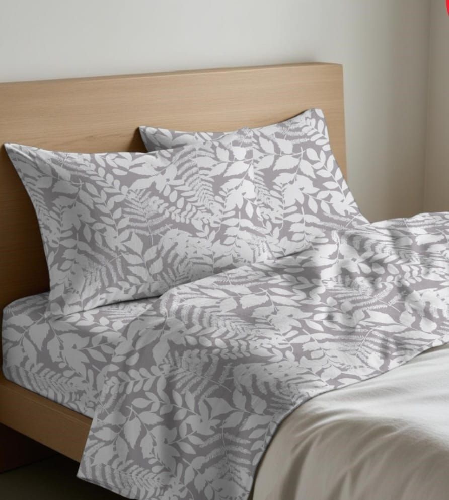 Foglie di felce stilizzate bianche su un tenue fondo pastello per creare un contrasto delicato e rilassante. Queste le note salienti di questo bel completo lenzuola in cotone che realizza un effetto delicato e molto raffinato. Il lenzuolo fa parte della linea QUADRIFOGLIO di GI.PE.Tex. Il completo lenzuolo e' composto da : un lenzuolo per sopra di cm. 250x300; un lenzuolo per sotto con angoli di cm. 180x200x25; due federe a sacchetto di cm. 50x80 con patella interna di circa cm. 20. Tessuto 100% cotone. Prodotto made in Italy. Confezione busta in plastica. Istruzioni di lavaggio al capo.