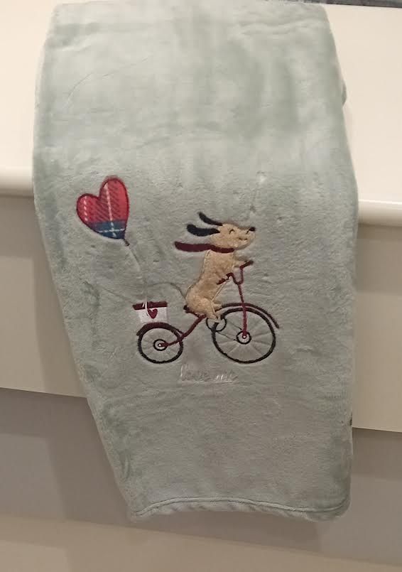 Un cagnolino libero felice e sorridente che con le orecchie tese dal vento scarrozza il suo palloncino a forma di cuore e' il punto focale di questo bel plaid di Noi di Notte. Un tenero compagno per le fredde giornate in casa ma anche una bella idea regalo con la sua confezione accattivante. Il plaid e' realizzato in morbido coral fleece e il cagnolino e' applicato.Il plaid misura cm. 130x160. Tessuto 100% poliestere. Prodotto made in Cina. Confezione busta in plastica. Istruzioni di lavaggio al capo.