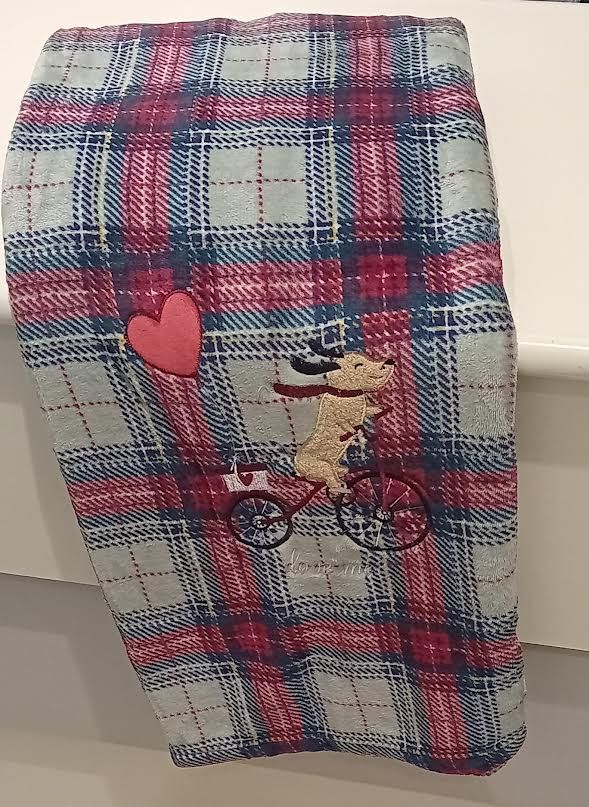 Un cagnolino libero felice e sorridente che con le orecchie tese dal vento scarrozza il suo palloncino a forma di cuore e' il punto focale di questo bel plaid di Noi di Notte. Un tenero compagno per le fredde giornate in casa ma anche una bella idea regalo con la sua confezione accattivante. Il plaid e' realizzato in morbido coral fleece e il cagnolino e' applicato.Il plaid misura cm. 130x160. Tessuto 100% poliestere. Prodotto made in Cina. Confezione busta in plastica. Istruzioni di lavaggio al capo.