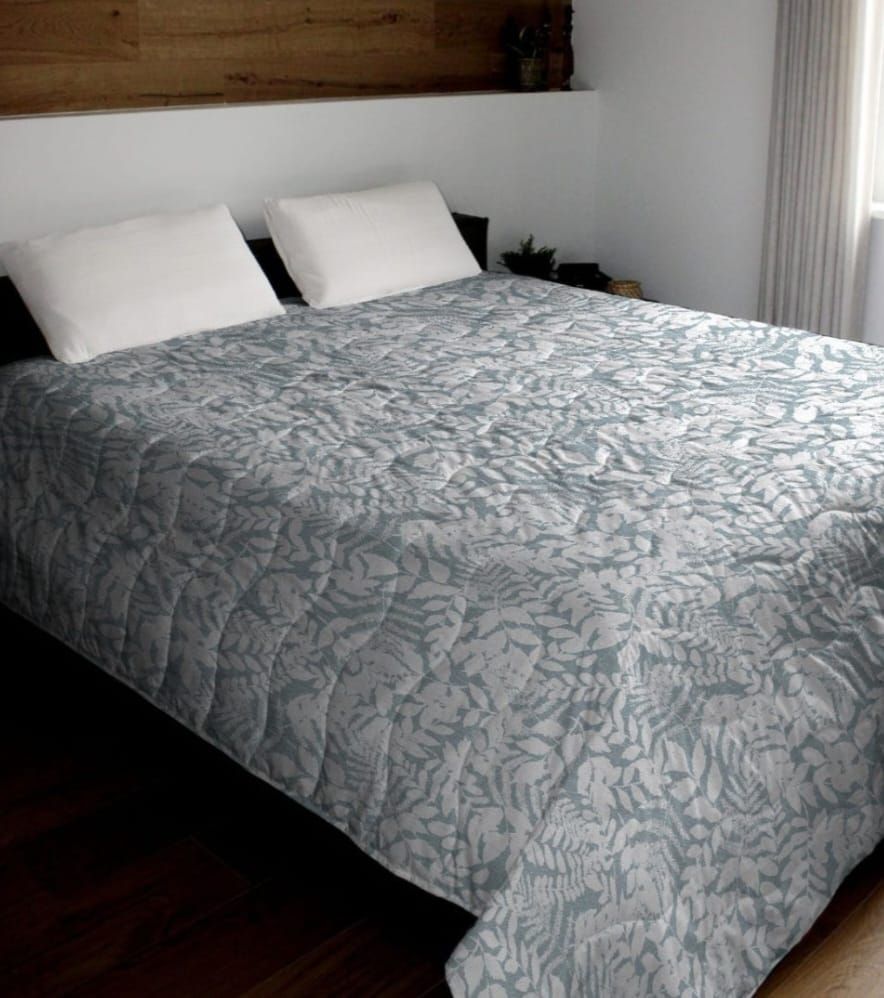 Foglie di felce stilizzate bianche su un tenue fondo pastello per creare un contrasto delicato e rilassante. Queste le note salienti di questo bel copriletto trapuntato matrimoniale che realizza un effetto delicato e molto raffinato. Il trapuntino fa parte della linea QUADRIFOGLIO di GI.PE.Tex. Tessuto 100% cotone. Imbottitura 100% Poliestere da 100 gr./mq. Misura cm. 260x270. Prodotto made in Italy. Confezione busta in plastica con zip. Istruzioni di lavaggio al capo.