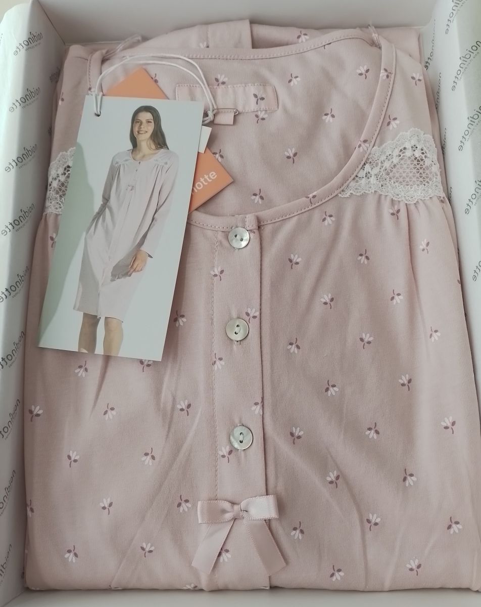 CAMICIA DA NOTTE DONNA IN COTONE A MANICA LUNGA. LA CAMICIA E' IN 100% COTONE E COMPLETAMENTE ABBOTTONATA SUL DAVANTI. LA ABBOTTONATURA DELLA CAMICIA E' NASCOSTA DOPO IL TERZO BOTTONCINO. LA CAMICIA E' IMPREZIOSITA DA INSERTI IN PIZZO E DA UN LEZIOSO FIOCCHETTO SUL DAVANTI. PRODOTTO MADE IN CHINA. CONFEZIONE SCATOLA DI CARTONE.