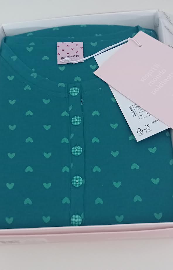 Morbidi e carezzevoli tessuti caratterizzano i pigiami delle collezioni Noi Di Notte. Il posto giusto dove infilarsi nelle fredde giornate invernali magari passate in casa in modalita' free time. Modello serafino per questo pigiama FA8787 con casacca e pantalone stampati in tenera fantasia cuoricini. La casacca e il pantalone sono entrambi senza polsini. La parte terminale bassa di casacca e pantalone sono impreziosite da un lezioso inserto in pizzo in tinta.Tessuto 80% cotone 20% poliestere. Prodotto made in Cina. Noi Di Notte. Istruzioni di lavaggio al capo. Confezione scatola in cartone. Per le taglie diamo le seguenti approssimative indicazioni in centimetri : Torace Xs 82 S 86 M 90 L 94 XL 98 Vita Xs 64 S70 M 74 L 78 Xl 82 Bacino Xs 90 S 94 M 98 L 102 Xl 106