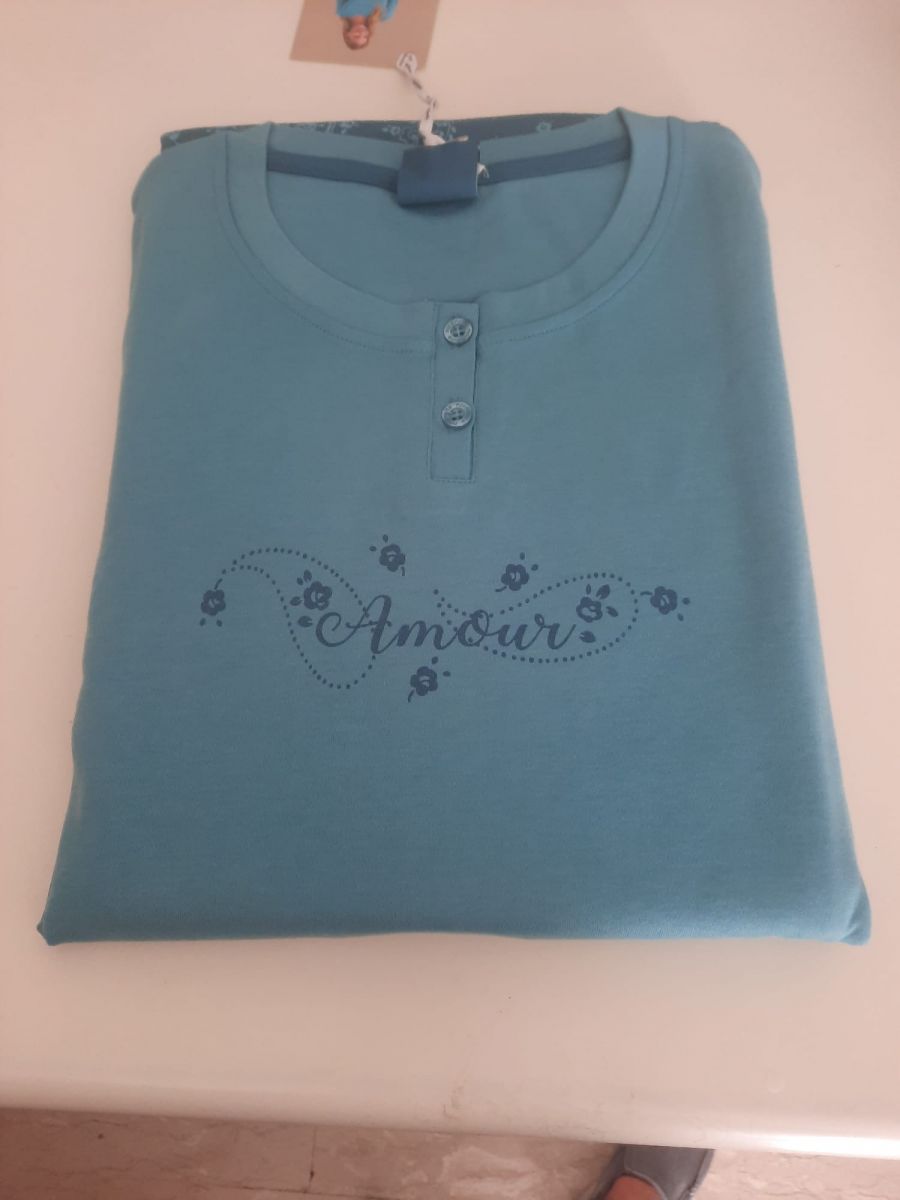 Morbidi e carezzevoli tessuti caratterizzano i pigiami delle collezioni Noi Di Notte. Il posto giusto dove infilarsi nelle fredde giornate invernali magari passate in casa in modalita' free time. Modello serafino a due bottoni per questo pigiama FA9266. La casacca è in modello serafino a due bottoni in tinta unita con scritta Amour sul davanti ed ha i polsini; il pantalone è senza polsini ed e' stampato in bella fantasia cachemire. Tessuto 80% cotone 20% poliestere. Prodotto made in Cina. Noi Di Notte. Istruzioni di lavaggio al capo. Confezione : busta in plastica, anima in carta, cartellino in cartoncino e nastrino in tessuto sintetico con spilla in metallo.