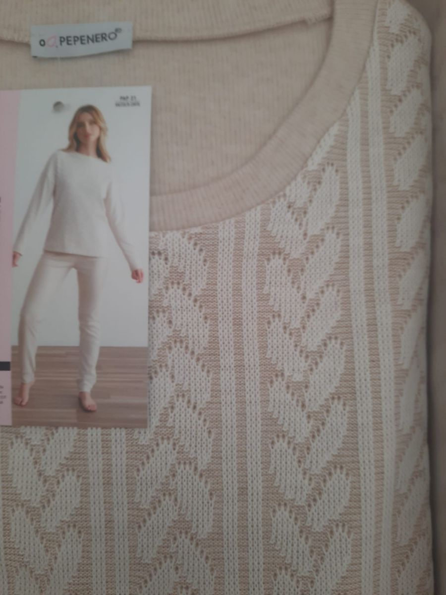 Il pigiama e' in modello girogola con un elegante effetto millerighe sul dietro e sulle maniche e una bellissima lavorazione jaquard sul davanti.