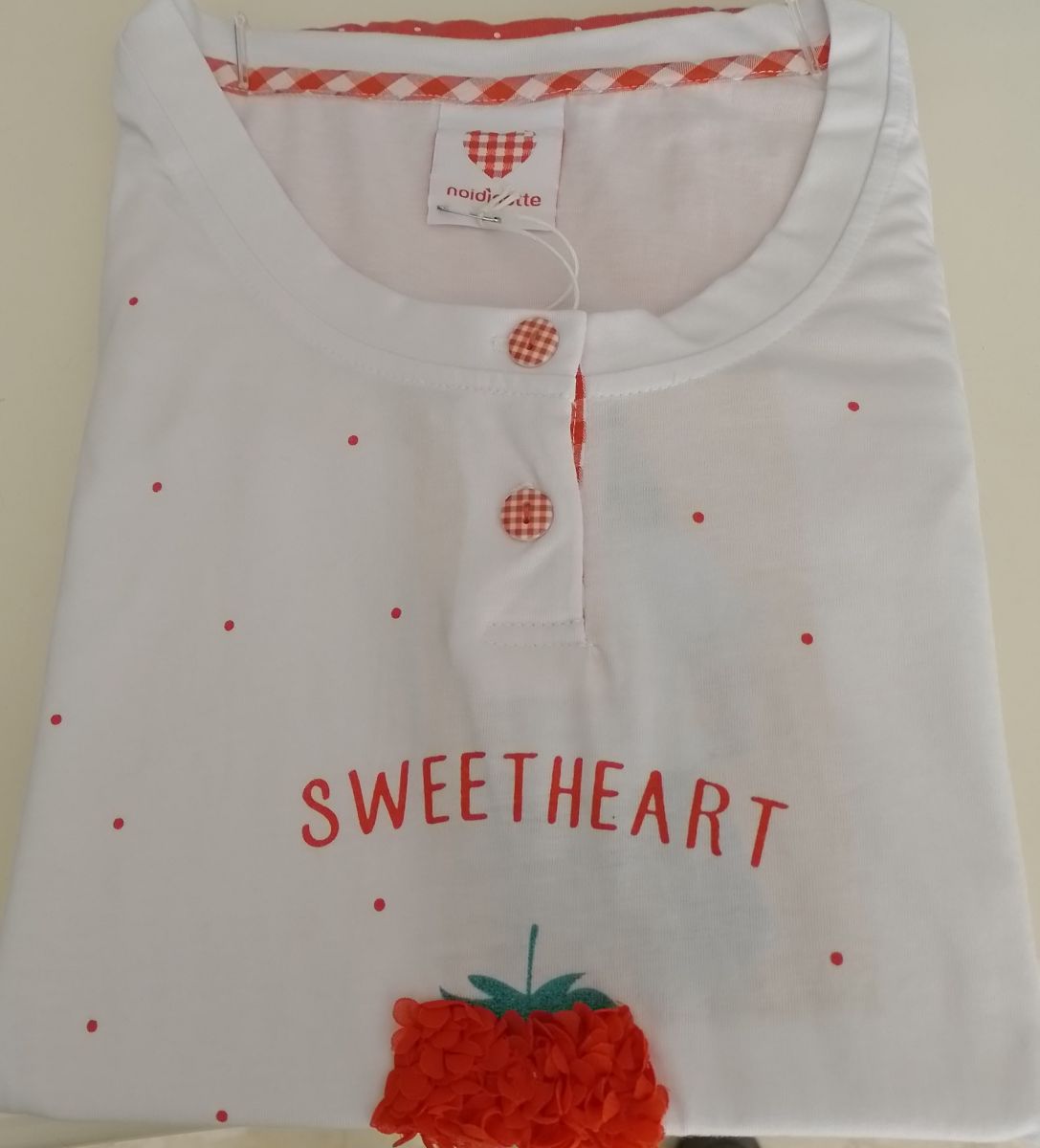 PIGIAMA DONNA IN JERSEY DI COTONE CON MANICA CORTA E PANTALONE CORTO. MAGLIA CON SIMPATICA FRAGOLA APPLICATA SUL DAVANTI E PANTALONE IN FANTASIA MICROPOIS. SIA LA MAGLIA SIA IL PANTALONE SONO IMPREZIOSITI DA UN RICCETTO IN NAVETTA DI COTONE CON FANTASIA VICHY.