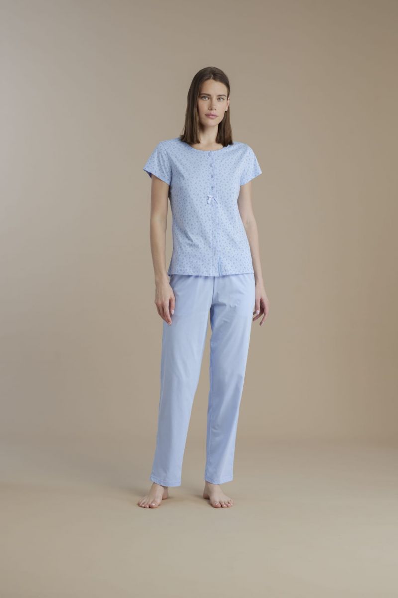 Una fantasia molto minimal di piccoli fiorellini su un classico fondo celeste o rosa caratterizza questo pigiama da donna in cotone della collezione Primavera Estate 2025 di Noi Di Notte. Il pigiama ha il pantalone lungo senza polsino e la casacca con maniche corte. La casacca e' tutta abbottonata sul davanti con la abbottonatura che e' visibile fino al quarto bottone e poi diventa nascosta ed e' impreziosita da un leziosissimo fiocchetto. Tessuto cotone 100%. Istruzioni di lavaggio al capo. Confezione busta in plastica. Prodotto made in Cina.