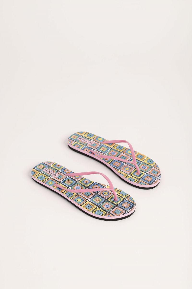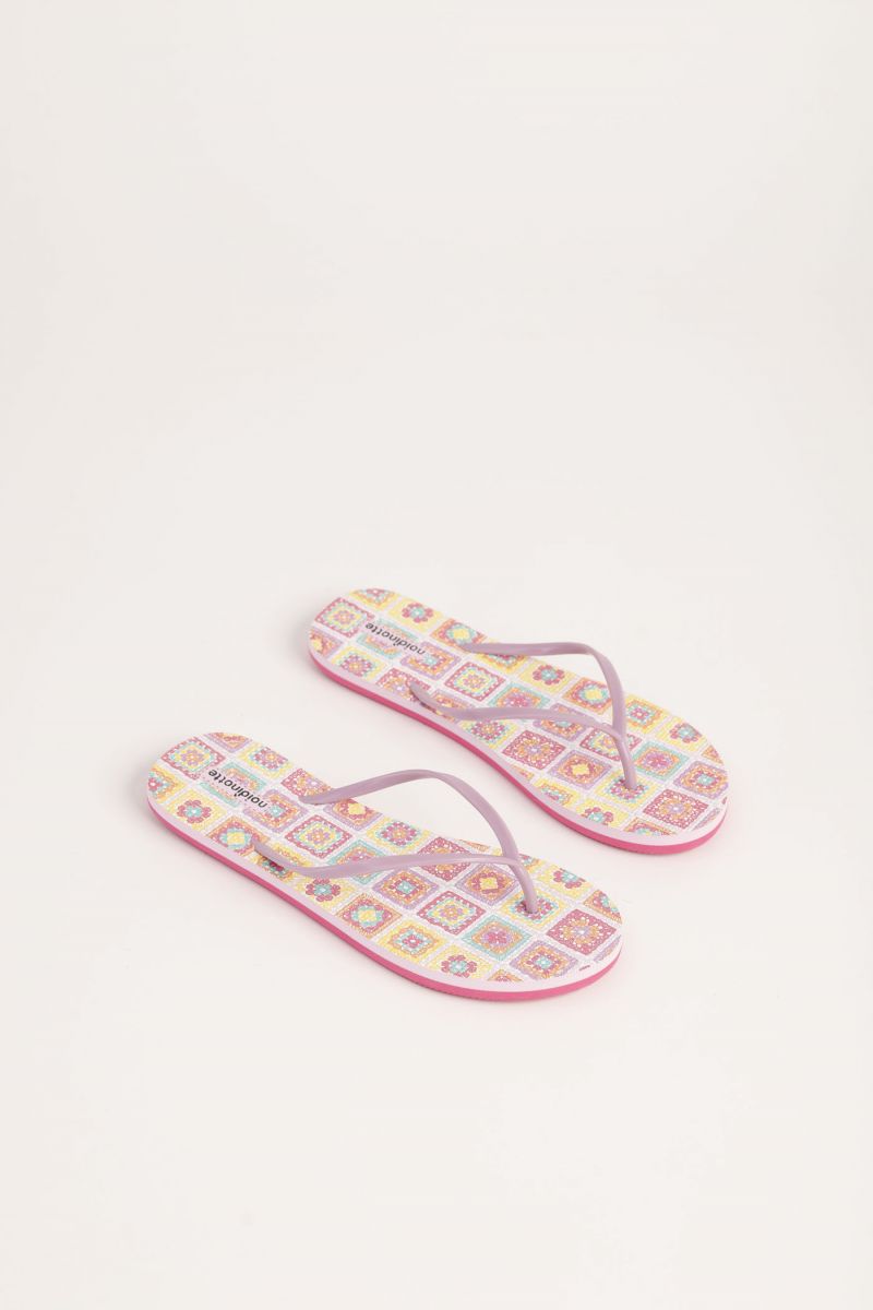 Mare sole voglia di estate. Tutto questo e' ritrovabile in questo coloratissimo infradito in gomma di Noi Di Notte.Infradito in gomma con pianta in fantasia effetto maglia. Istruzioni di lavaggio alla sezione foto e al capo. Prodotto made in P.R.C. Confezione busta in plastica con supporto in cartone.