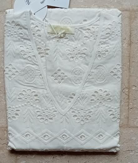 Noi di Notte collezione P.e. 2024. Abito corto da donna con scollo a punta e maniche a tre quarti. La lavorazione traforata tipo Sangallo lo rende un classico dell'abbigliamento mare ma non solo. Impreziosito da una leziosa finitura tipo smerlo su maniche e sulla parte al ginocchio.Tessuto 100% cotone. Confezione: busta in plastica. Prodotto made in China. Lavare in lavatrice max 30°centrifuga breve; non usare candeggina; stirare a 150°max; non lavare a secco, non usare Tumbler. Istruzioni di lavaggio al capo. Si consiglia un primo lavaggio con acqua fredda e aceto di vino bianco unitamente a una centrifuga molto leggera. Per le taglie diamo le seguenti indicazioni in centimetri : Torace XS82 S86 M90 L94 XL98 Vita XS64 S70 M74 L78 XL82 Bacino XS90 S94 M98 L102 XL106.