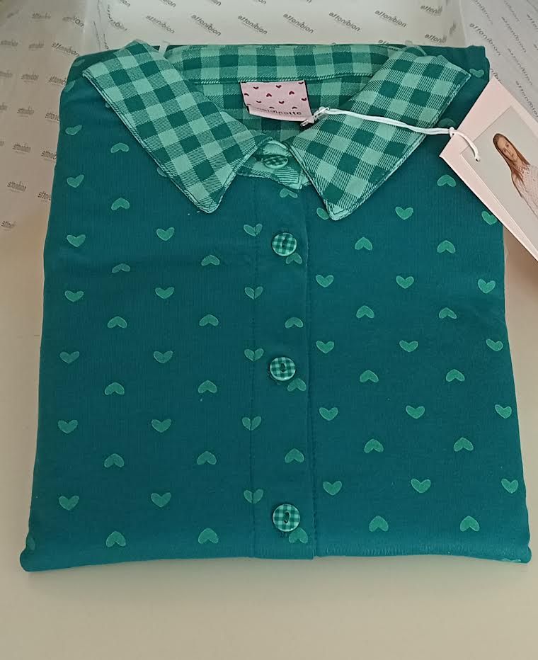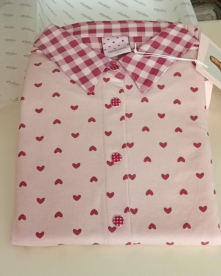 Morbidi e carezzevoli tessuti caratterizzano i pigiami delle collezioni Noi Di Notte. Il posto giusto dove infilarsi nelle fredde giornate invernali magari passate in casa in modalita' free time. Modello molto elegante per questo pigiama FA8825. Il pigiama ha pantalone e casacca entrambi senza polsini. La casacca e' in modello maschile con collo e abbottonatura. Molto lezioso il disegno cuoricini con contrasto vichy sul colletto e sulle rouches di maniche e pantalone.Tessuto 80% cotone 20% poliestere. Prodotto made in Cina. Noi Di Notte. Istruzioni di lavaggio al capo. Confezione scatola in cartone. Per le taglie diamo le seguenti approssimative indicazioni in centimetri : Torace Xs 82 S 86 M 90 L 94 XL 98 Vita Xs 64 S70 M 74 L 78 Xl 82 Bacino Xs 90 S 94 M 98 L 102 Xl 106