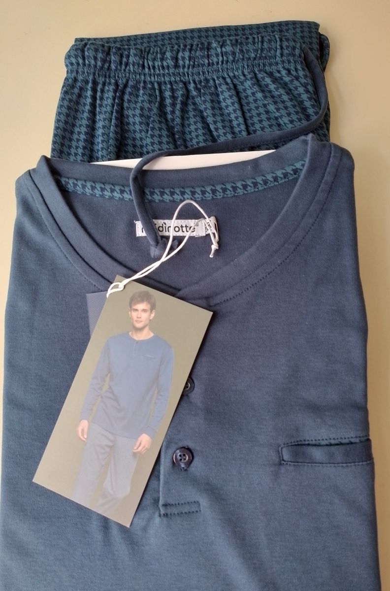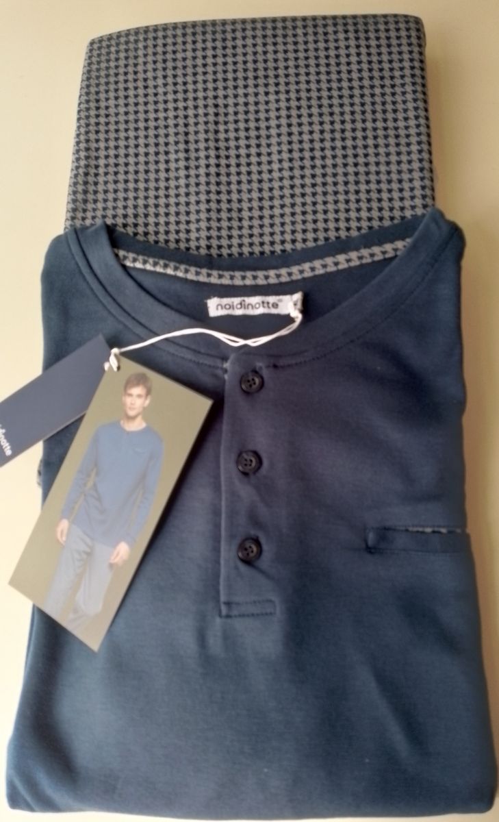 PIGIAMA UOMO NOI DI NOTTE IN CALDO COTONE. COMPOSIZIONE 80%COTONE 20% POLIESTERE. PANTALONE DISEGNO PIED POULE CON POLSINI E COULISSE IN VITA. CASACCA TINTA UNITA CON RIPORTINO PIED POULE SUL RETROCOLLO E POLSINI ALLE MANICHE. PRODOTTO MADE IN CHINA. CONFEZIONE SCATOLA DI CARTONE.